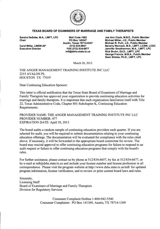 This letter is official notification that the Texas State Board of Examiners of Marriage and Family Therapists has approved your organization to provide continuing education activities for marriage and family therapists. It is important that each organization familiarize itself with Title 22, Texas Administrative Code, Chapter 801-Subchapter K, Continuing Education Requirements.